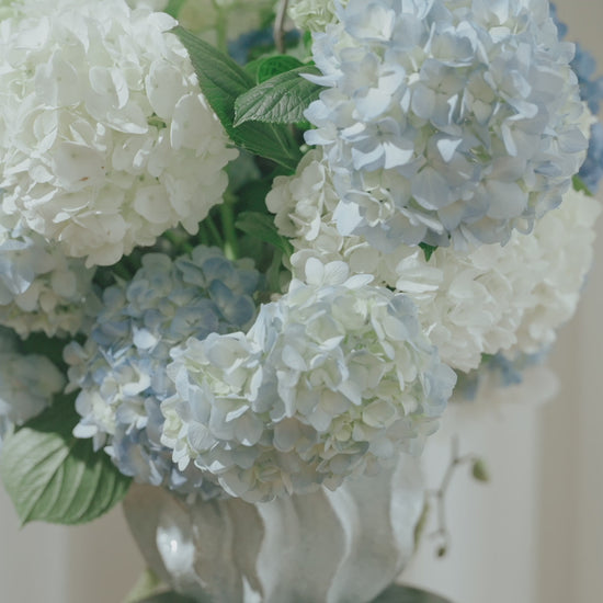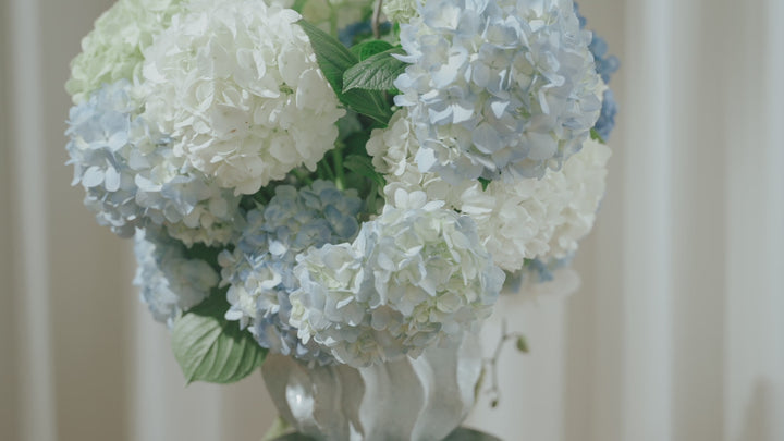 A striking arrangement in soothing shades of blue and white, "Léo" combines the elegance of blue and/or white hydrangeas, yellow or blue orchids, and crisp white roses. Inspired by the beauty of nature, this arrangement offers a serene yet vibrant touch, perfect for adding sophistication and charm to any setting.